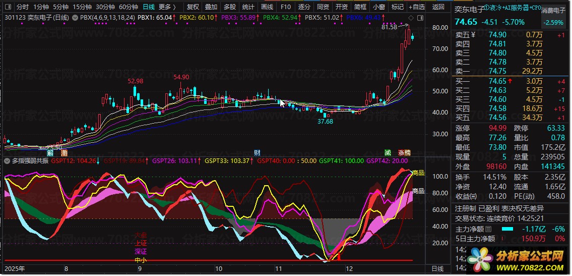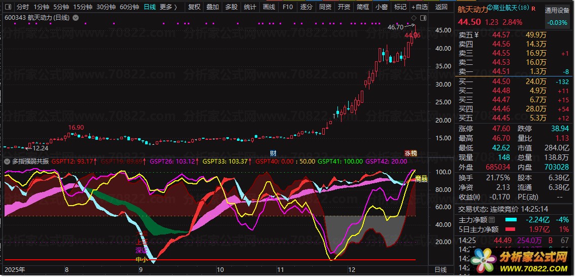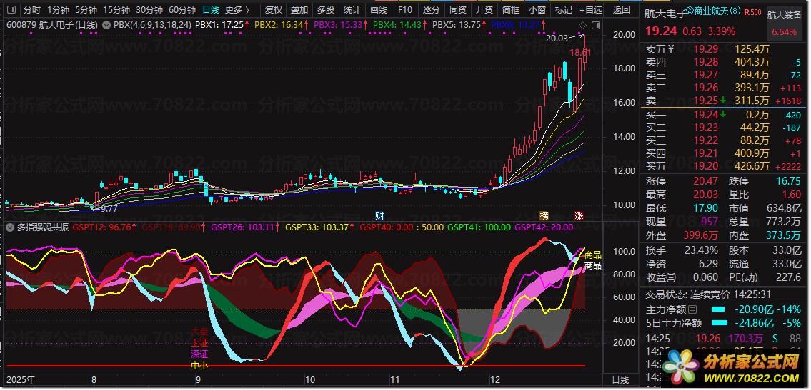 将本公式加载至通达信软件副图。图表中上部色带区域代表个股动力,下部多根彩色粗线代表各指数强弱。投资者应首要观察个股线与指数线的总体方向是否一致(共振),并重点把握个股双线金叉、低位红柱信号与市场共振向上的“甜蜜点”。本公式是识别市场合力方向、规避系统性风险、捕捉强势股的利器。