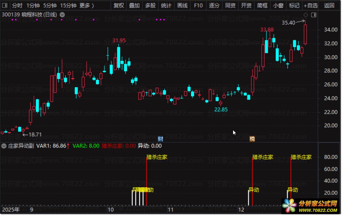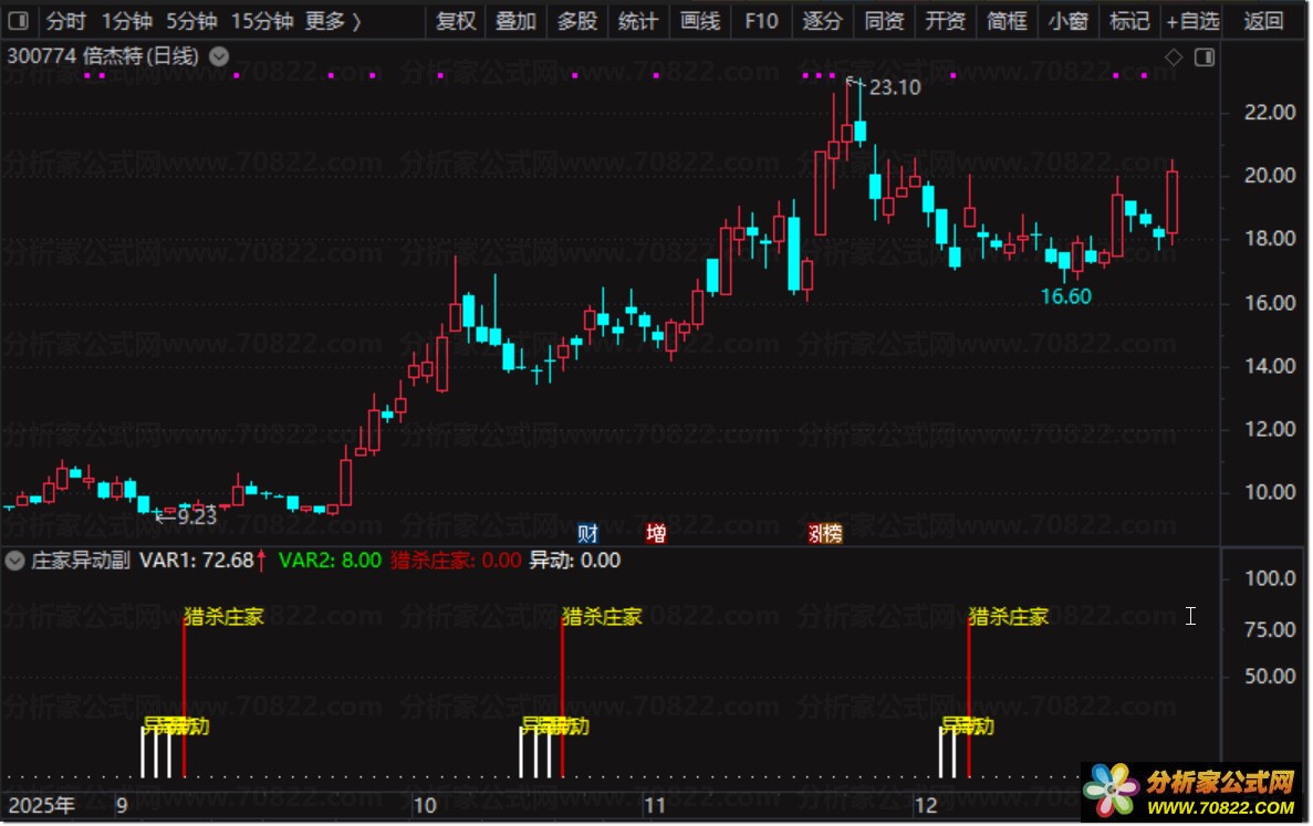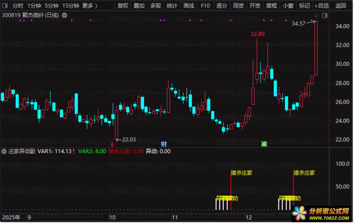 〖庄家异动〗副图/选股指标—-—精准捕捉庄家异动信号(附使用方法详解) 今天为大家分享一个名为“庄家异动”的副图选股指标,该指标不含未来函数,信号稳定可靠,适用于捕捉庄家异动带来的短线买点机会,在震荡行情中同样具备较高准确率。以下是“庄家异动”指标的详细使用方法: