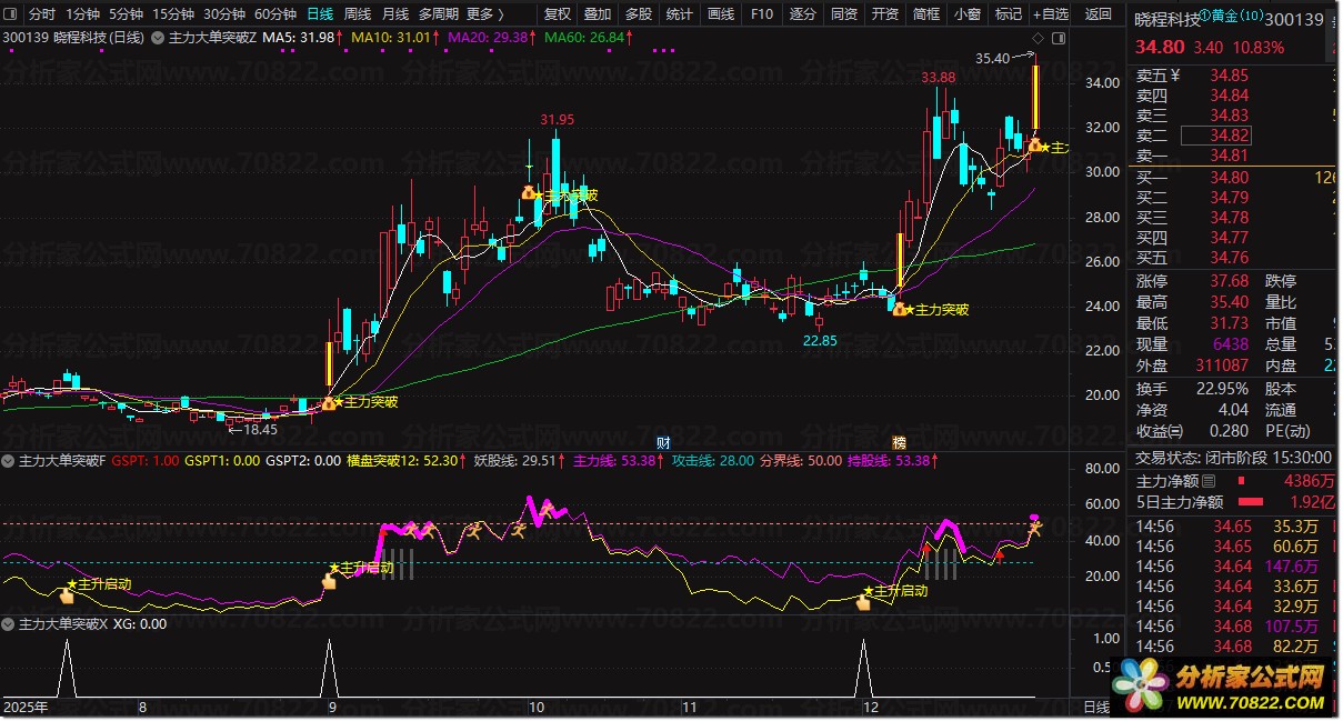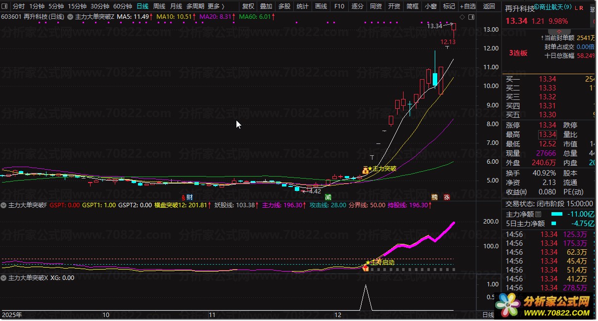 1. 综合研判:主图出现突破图标时,立即查看副图是否同步出现“★主升启动”信号,并确认“横盘突破12”站上攻击线,以增强可靠性。