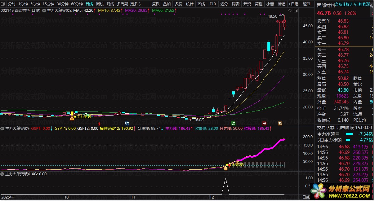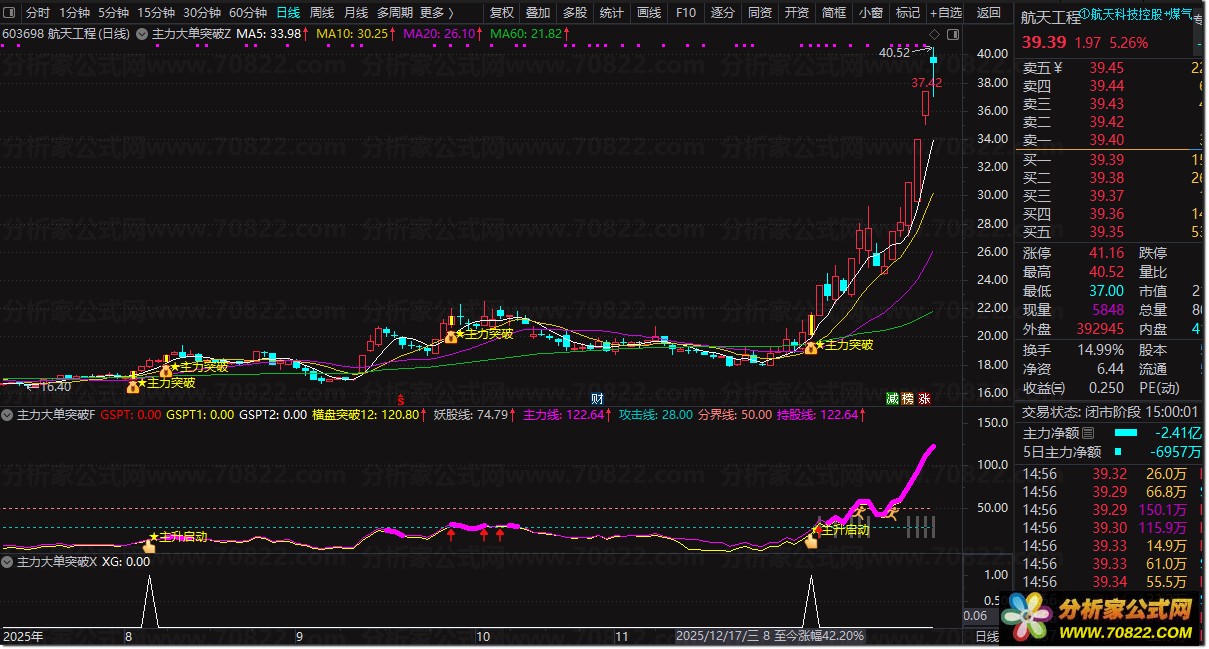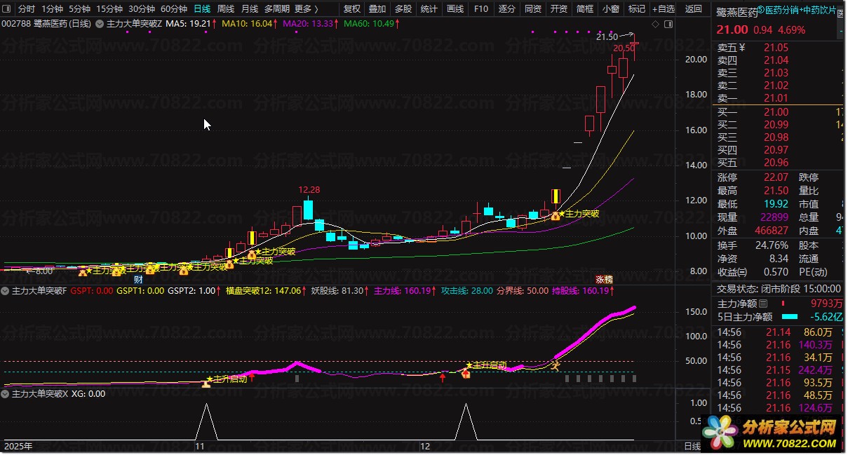 核心在于识别“横盘突破”。它结合均线多头排列(MA5>MA10>MA20)与价格突破近期震荡区间,当条件满足时,K线会标记黄色柱状并显示“★主力突破”图标,直观提示买点。