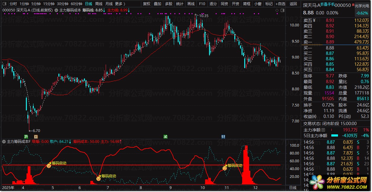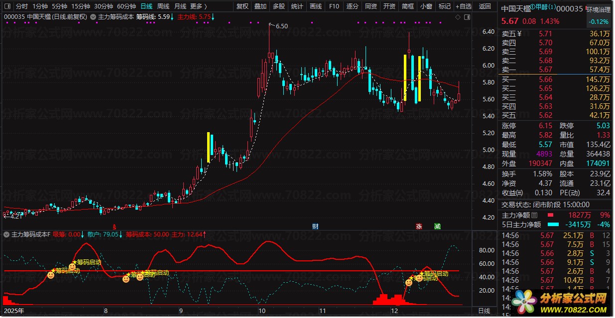 2. 副图指标:用于量化分析市场状态。其中“吸筹” 线试图反映资金低位收集筹码的强度。“散户”线代表55日内股价的相对高位,数值越低说明股价离近期高点越远;“主力”线则是由KDJ衍生出的短期动能线。当“主力”线由下上穿“散户”线,且股价位于10日均线之上时,发出“★筹码启动”信号,提示可能出现由弱转强的节点。