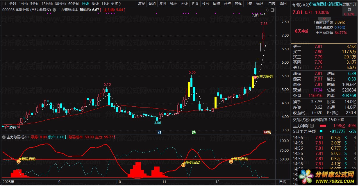 1. 主图指标:核心在于观察趋势与识别异动。图中的黄色柱标识涨停K线,筹码线(5日线) 与主力线(30日线) 构成短期与中期趋势参考。更关键的是,公式通过复杂的量价关系模型,在满足特定条件(如涨幅、量比、股价位置等)时,标记出“★主力筹码”信号,提示可能存在主力资金活跃的痕迹,需结合位置综合判断。
