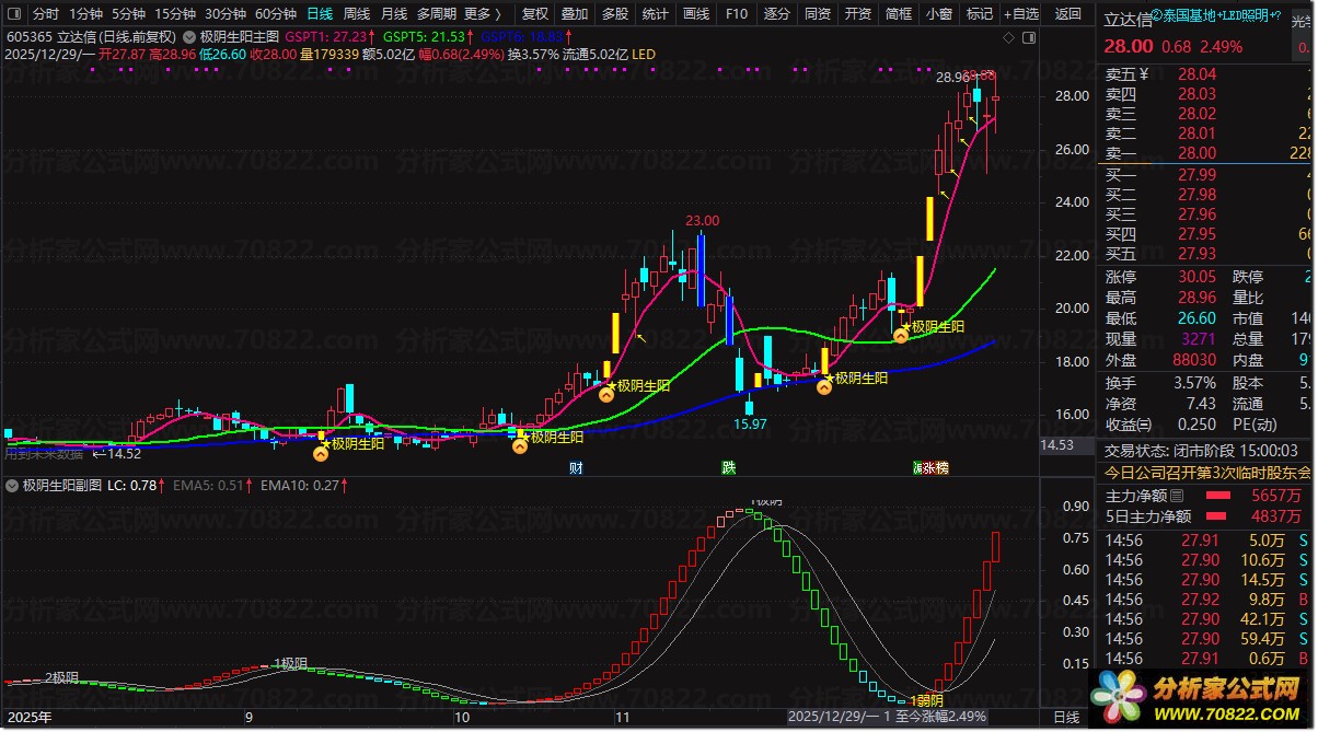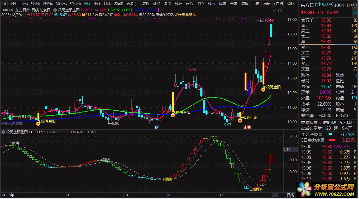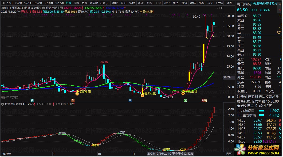 1. 主图指标(作战地图):它是核心的多空趋势仪表盘。图中紫色快线、黄色中期线及绿色/蓝色长期线构成多层均线系统,用于判定趋势强度与方向。其精华在于自动标记“★极阴生阳”预警信号及“↖”强势箭头,并高亮涨停、跌停K线,为判断多空转换提供直观的视觉参考。