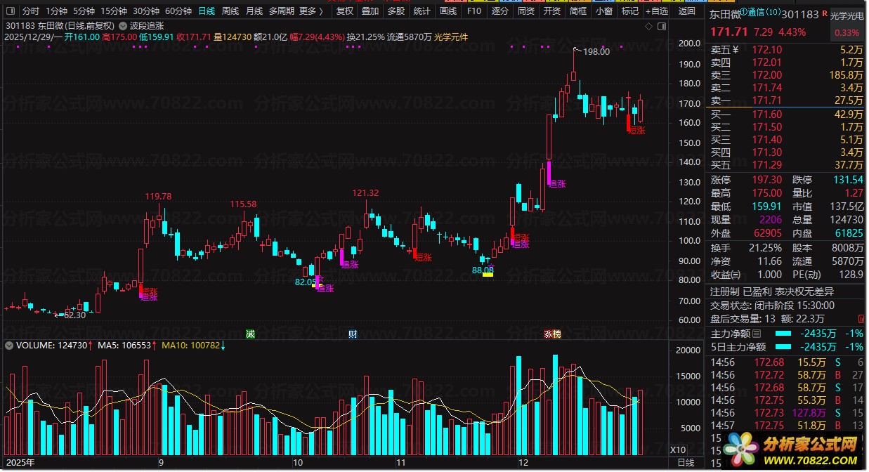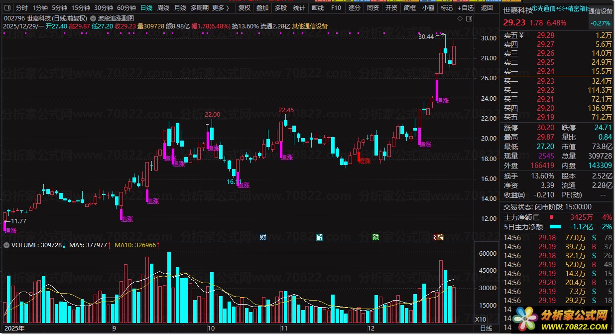 2. 强势追涨:K线下方出现紫色“追涨”文字,提示股价放量突破且短线拉升动能强,可积极跟进;