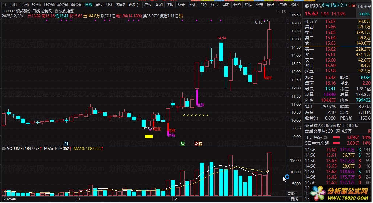 本公式围绕股价波段运行规律构建,融合均线、量价、超买超卖等多维度数据,通过多层指标计算筛选有效上涨信号。核心通过移动平均、乖离率、突破验证等逻辑,识别股价低位反弹、突破关键价位、短线强势拉升等场景,精准定位波段追涨机会。公式内置多组条件校验,剔除虚假信号,通过黄色柱线、彩色文字标注等可视化方式呈现信号,直观易懂。