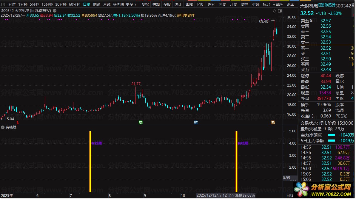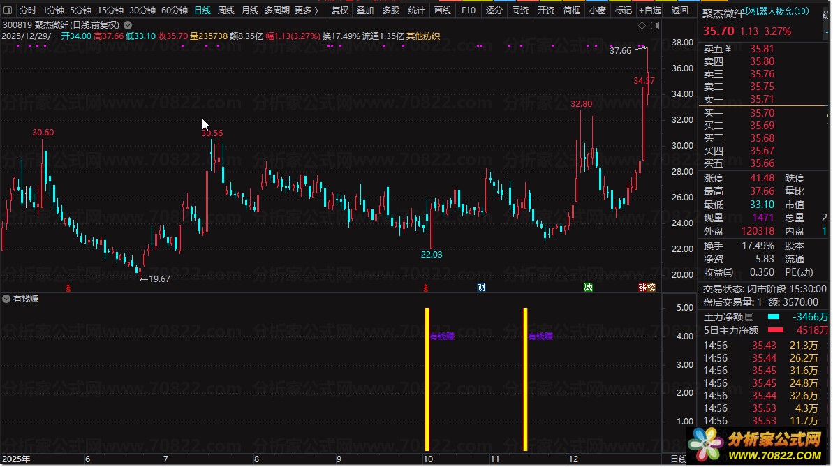 1.有钱赚指标仅一个买入信号提示,买入后等待拉升即可;