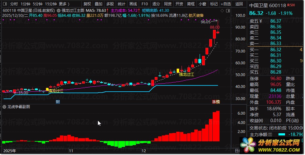 1. 强龙过江主图指标中,白色虚线代表短线5日均线,紫色线为主力成本线,青色线为短期成本线。当白色5日均线上穿紫色主力成本线时,表明个股进入短线走强阶段,是短线交易的重要参考信号。