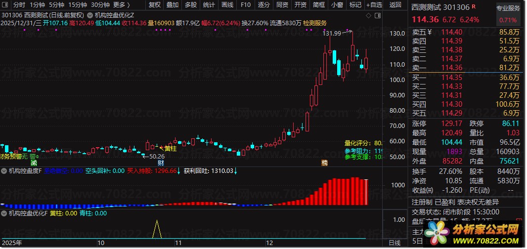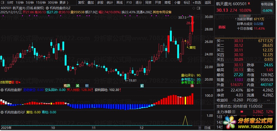 〖机构控盘优化主图〗洞察主力动向,黄青双柱预警强势股! 本公式“机构控盘优化主图”融合量价、趋势、财务与多因子评分系统,专为捕捉主力资金异动设计。核心逻辑基于EMA差值构建的“gspt”系列信号,通过黄柱(强势启动)与青柱(低位吸筹)直观标注关键买点,并叠加涨停标识(红色K线),提升短线反应速度。
