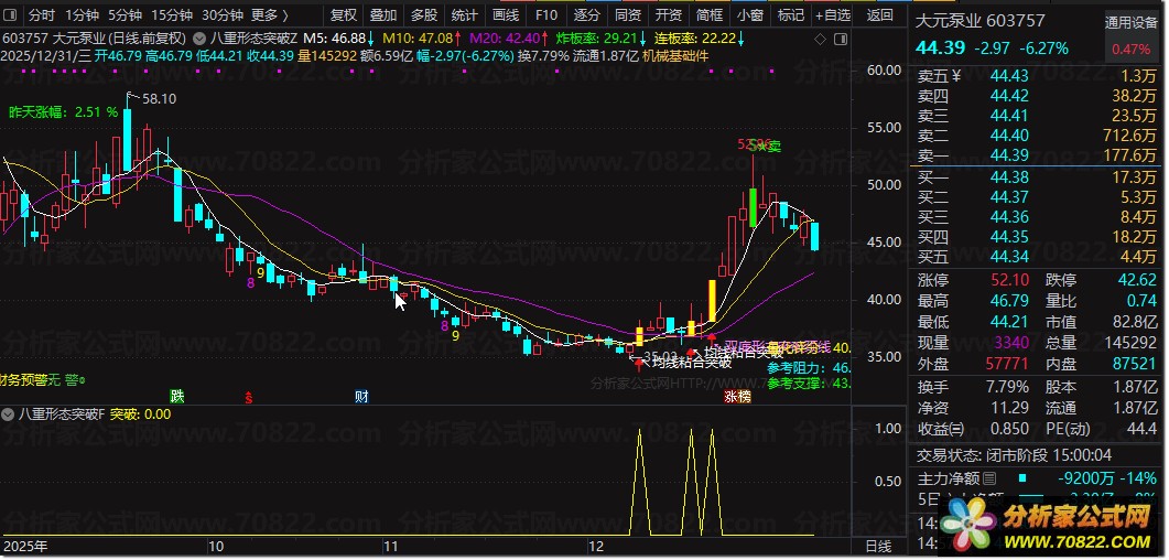2、该指标涵盖八大突破形态信号:均线粘合突破、双底形态突破颈线、箱体振荡突破、布林带突破、横盘整理突破、量价配合突破、MACD零轴上穿突破、KDJ低位金叉突破,全面覆盖常见技术突破场景。