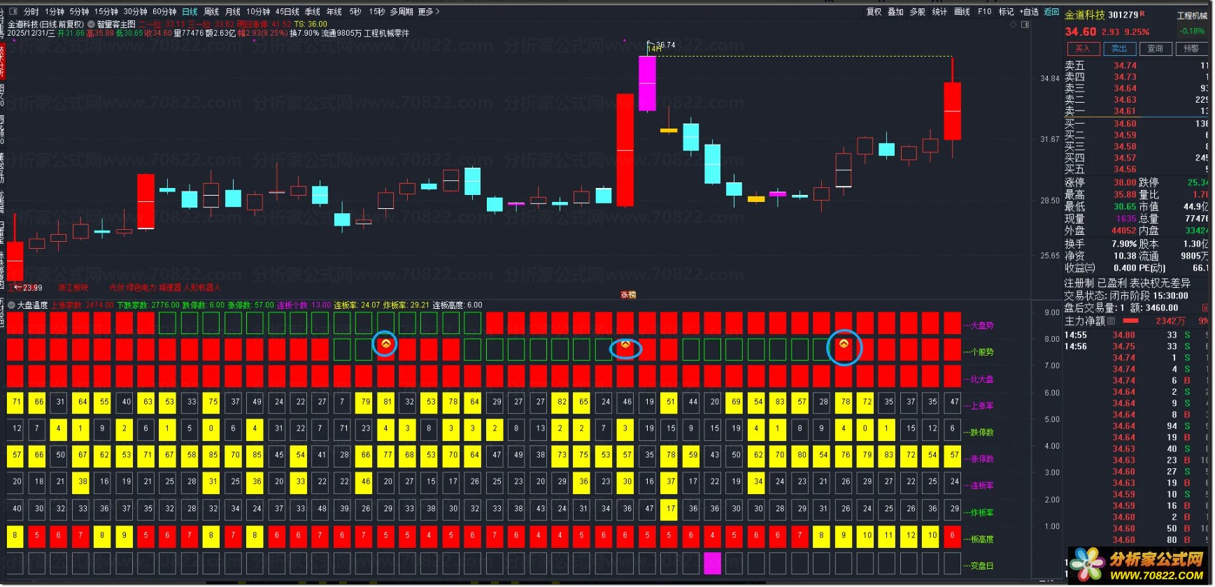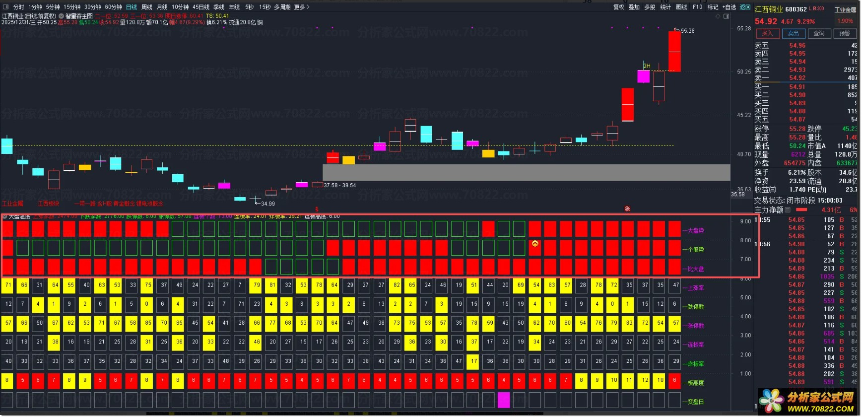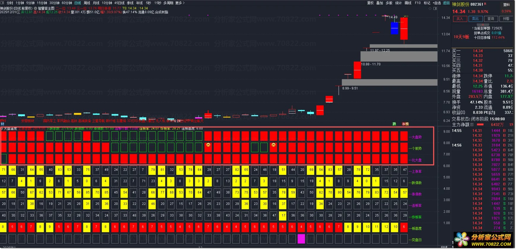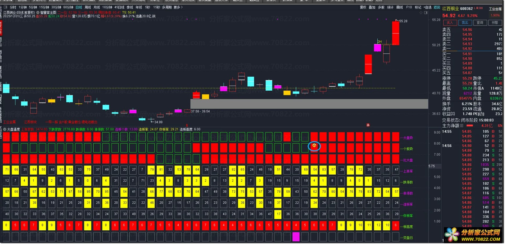 ![]() 该大盘温度副图指标上方三行分别监控大盘趋势、个股趋势及个股强度。在个股副图中显示的是对应大盘指数数据——002开头个股显示深成指数据,600开头个股则显示上证指数数据。当前所见即为上证指数的大盘温度数据。