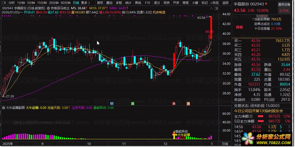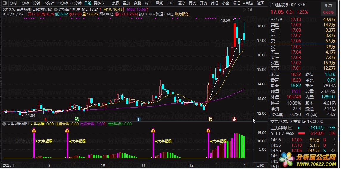 将公式导入通达信软件副图,适用于日线级别。当出现黄色“★大牛起爆”文字及洋红色柱状线时,视为潜在强势启动点,可结合量能异动信号(如突发放量突破)进一步确认。公式同时提供“控盘天数”“出货天数”等辅助数据,帮助投资者把握主力运作节奏,规避高位出货风险。适合短线激进或波段投资者使用。