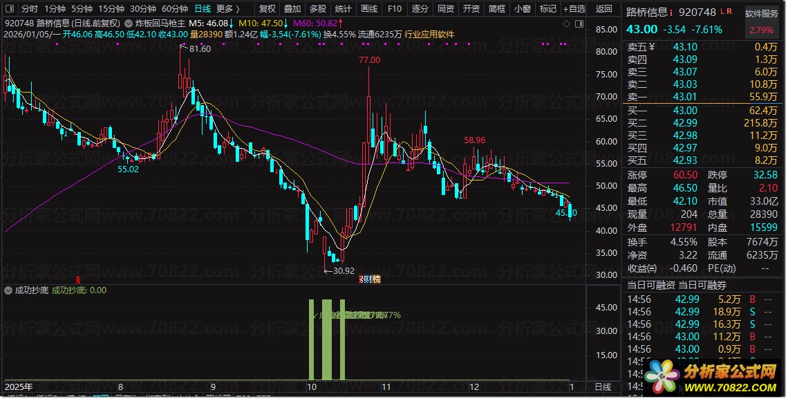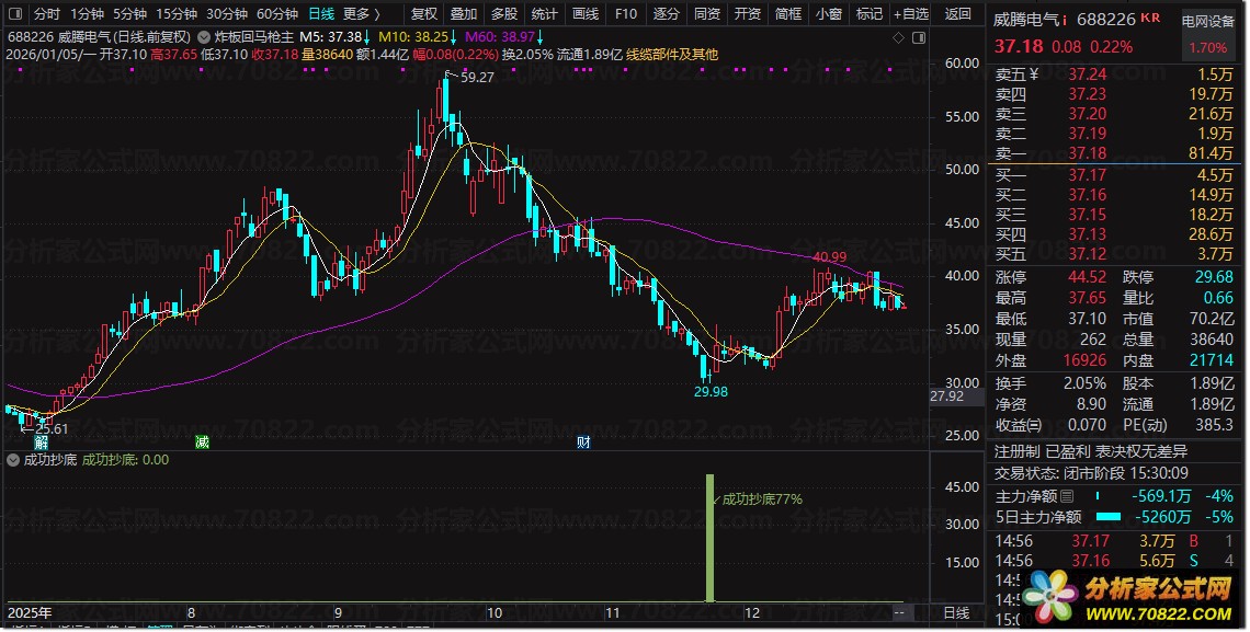 将公式导入通达信软件,在个股K线图中加载,当出现绿色“↙成功抄底77%”文字及柱状图时,即为潜在抄底机会。建议配合基本面分析与市场情绪综合判断,避免单边下跌趋势中的“接飞刀”。适用于中短线投资者在震荡市或熊市末期寻找高赔率入场点。