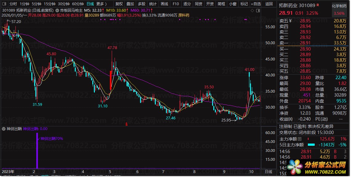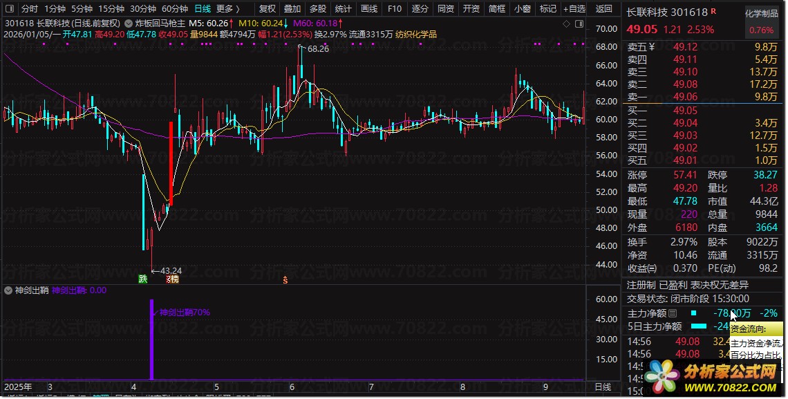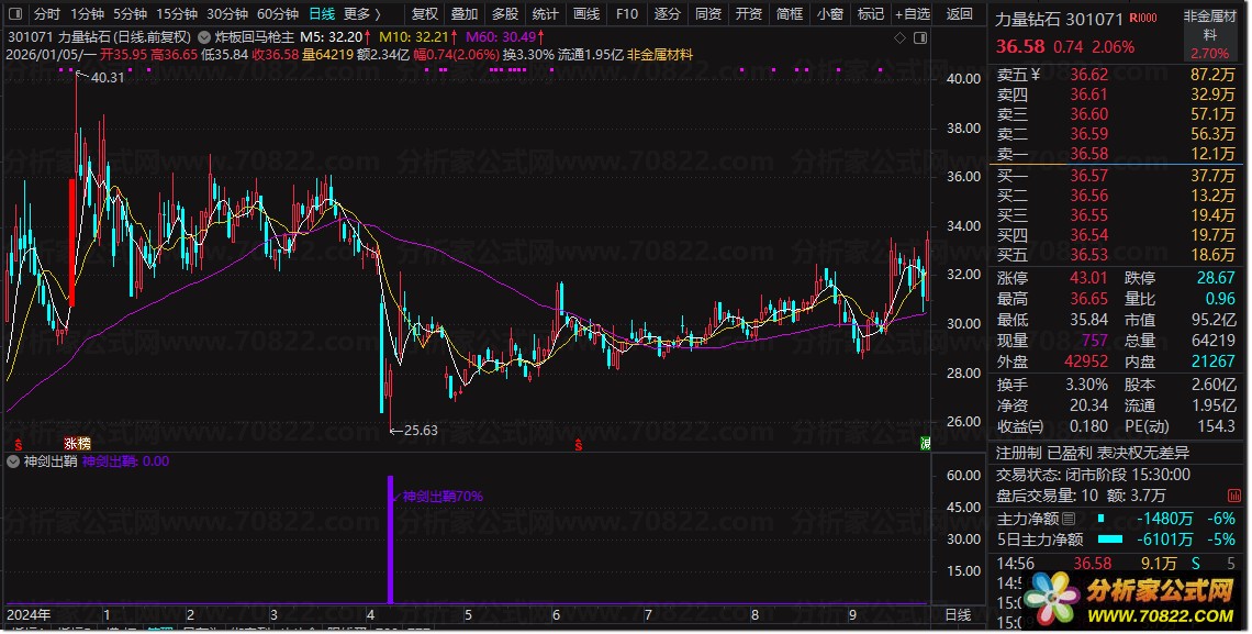 当公式在K线图上绘制粉色柱状图并标注“↙神剑出鞘70%”时,即为强烈买入提示。