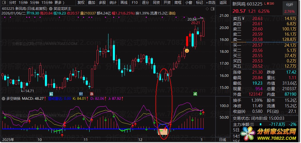 多空转换指标是融合MACD趋势判断与KDJ超买超卖分析的复合型指标,核心通过量化股价偏离均线的幅度(VAR1-VAR6)生成MACD柱状线,结合KDJ的K、D、J值交叉信号,精准捕捉多空力量转换节点。指标内置多维度信号提示:当VAR6≤-6时出现红色“警戒雷达”,≤-10时触发黄色“出击”、红绿白三色“导弹发射”组合信号;同时标注超买(K/D超80)、超卖(J<0)区间,并通过箭头图标直观展示KDJ金叉/死叉、MACD多转空/空转多核心信号。