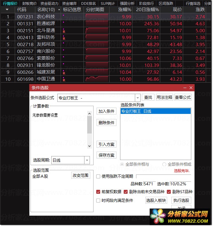 条件1:=(CLOSE>=ZTPRICE(REF(CLOSE,1),IF(FINANCE(3)=4,0.2,0.1)));