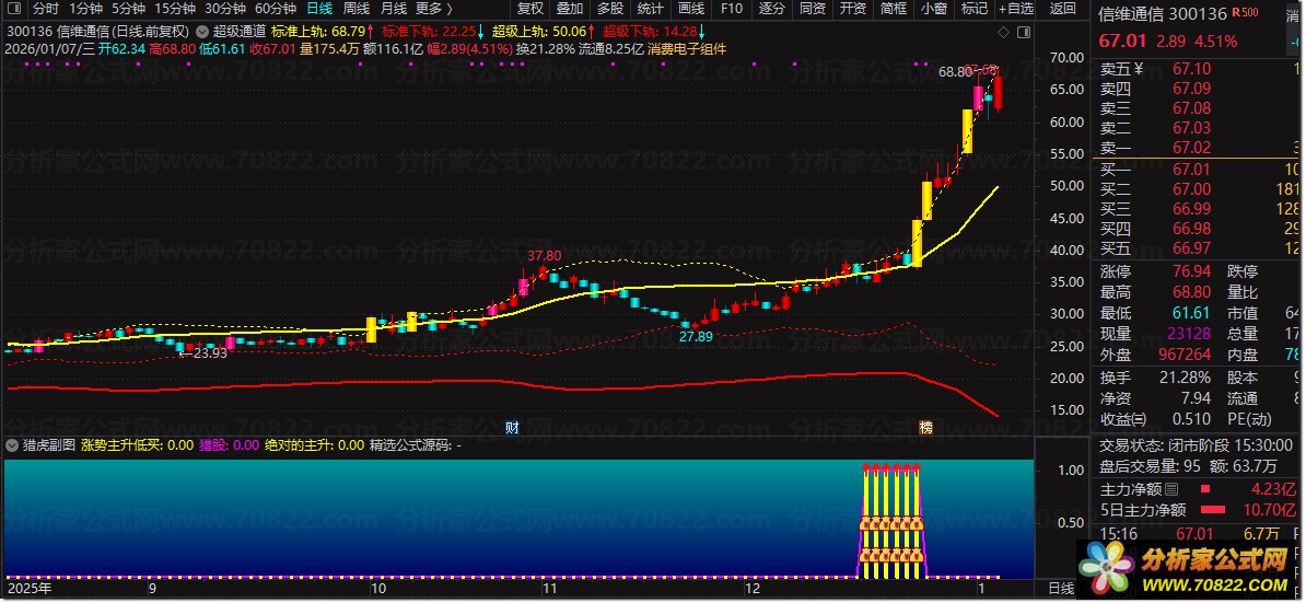 猎虎副图是一款聚焦趋势研判与买卖信号的通达信副图指标,核心围绕股价多周期均线、动态支撑压力线构建分析体系。公式先通过不同倍数的预测均线划定清仓、出货、高抛、低吸、满仓区间,再结合5/10/20/30/60日均线涨跌状态,叠加多维度上涨线(基于价格均值的周期高点均线)的趋势判断,最终筛选出“涨势为王”的上升趋势信号;同时通过DSA动态线衍生出顶部/底部区间,结合持仓线、生命线的趋势变化,精准锁定“绝对的主升”低吸信号,辅以图标提示,直观识别优质买点。