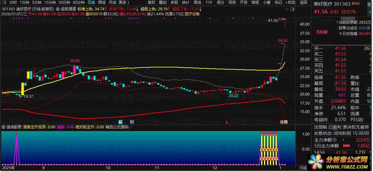 1. 信号识别:副图中黄色加粗柱体+笑脸/箭头图标为“绝对的主升”信号,是核心低吸点;洋红色柱线“猎股”为基础买入参考。