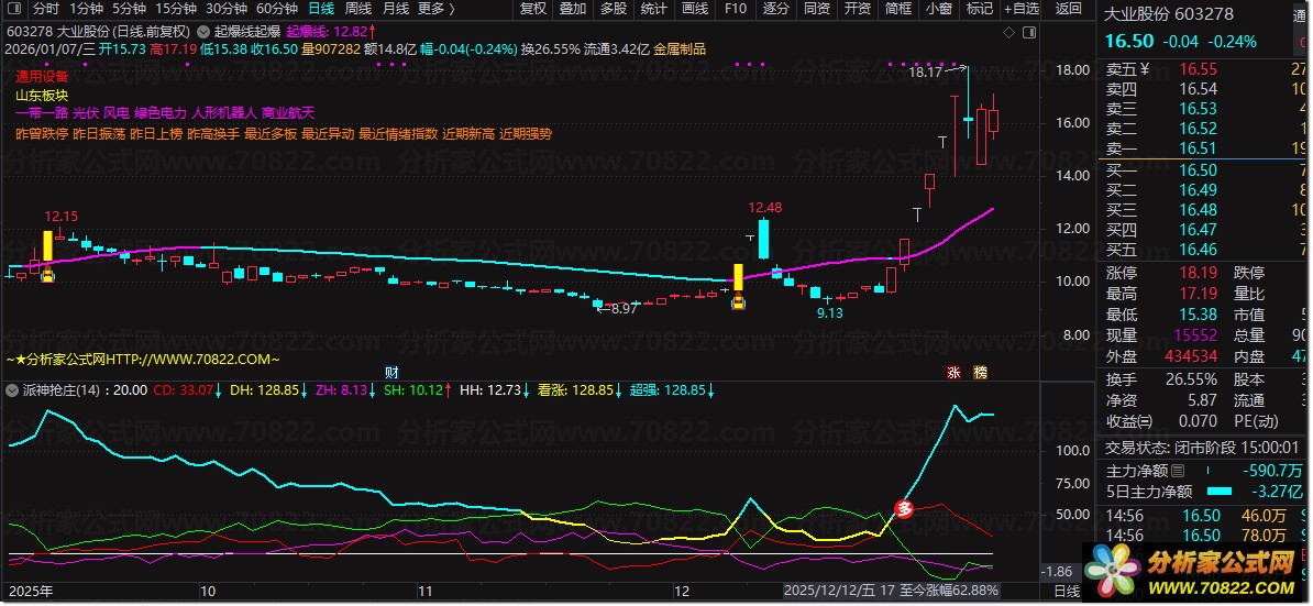 使用方法:叠加于个股K线下方副图区,重点关注黄色/青色粗线出现及图标提示,结合价格处于相对低位(DH适中、SH不高)时介入,可有效提高胜率。注意结合大盘环境与基本面筛选,避免追高风险。
