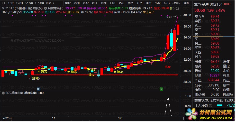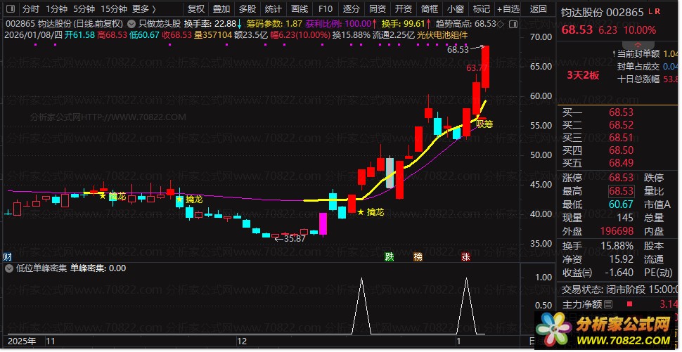 同时,公式引入多周期均线融合的“量化”趋势线,结合价格站上该线并同步突破5日、20日均线的共振信号,触发“★ 擒龙”买入提示。K线图中,涨停(≥9.8%)、一字板(≥19.6%)等强势形态以鲜明色彩高亮显示,直观捕捉龙头气质。