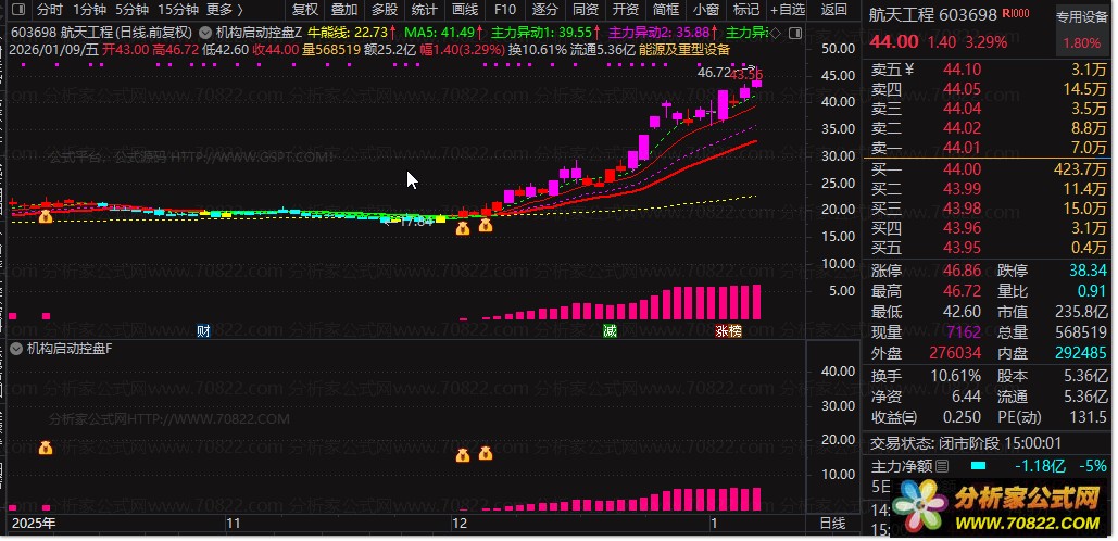 - 副图公式聚焦“机构成本偏离度”(ZA11>5%)与动能共振,通过柱状图与黄色虚线提示主力介入临界点;