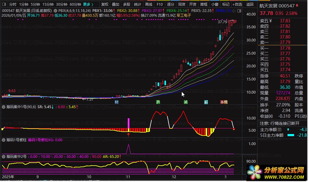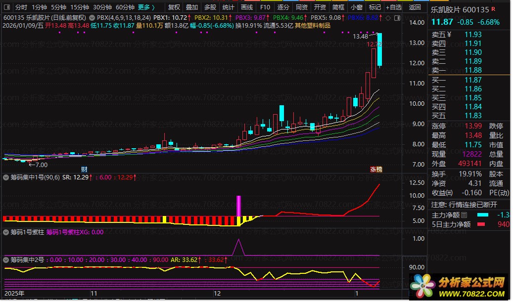 筹码集中1号出现紫柱。 筹码集中2号AR线下穿90线。 ![]() 上面是 乐凯胶片 那天选股就选出来他 我买入一直没跌破一直拿到现在 每天选股就2-3个 有的会洗盘1-2天才拉升 有的直接拉升。