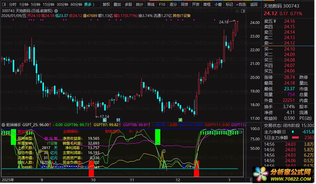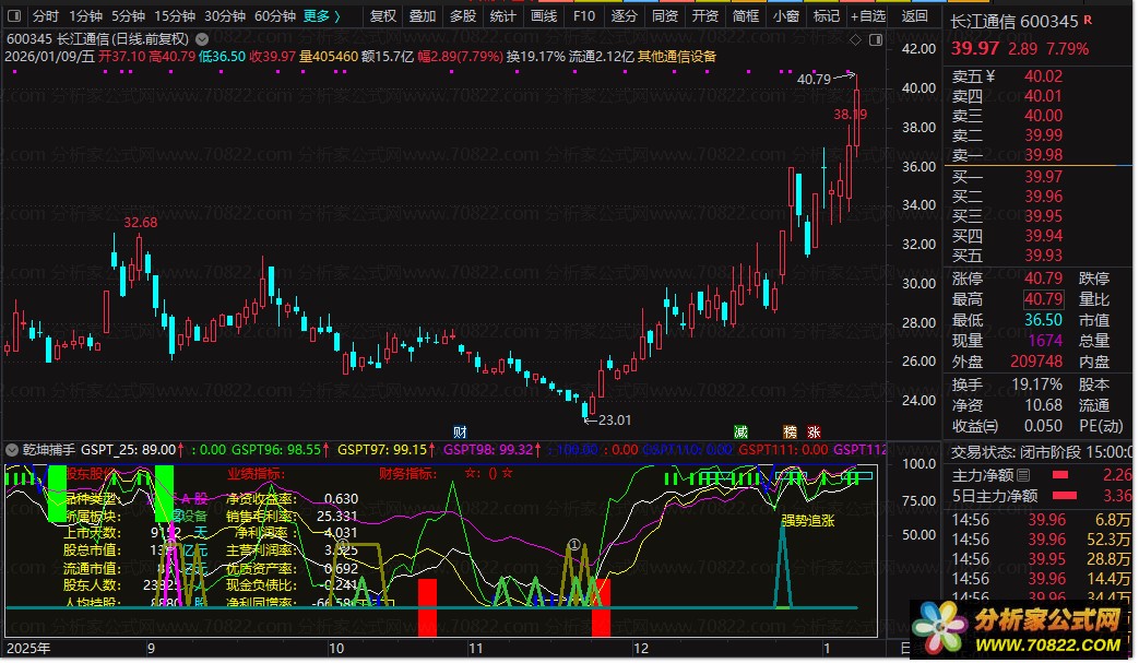〖乾坤捕手〗——一眼识主力,精准擒牛股! “乾坤捕手”是一款集基本面、资金面与技术面于一体的智能选股公式,专为通达信平台打造。它通过动态展示个股所属板块、股东结构、市值规模等关键信息,并融合净资产收益率、毛利率、现金负债比等核心财务指标,全面评估企业质地。同时,公式内嵌多组高灵敏度技术信号,如低位金叉、超跌反弹、强势追涨等,配合成交量与价格趋势分析,精准捕捉主力异动和启动临界点。