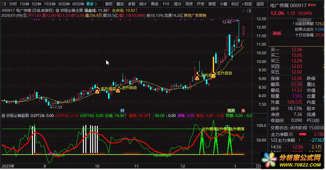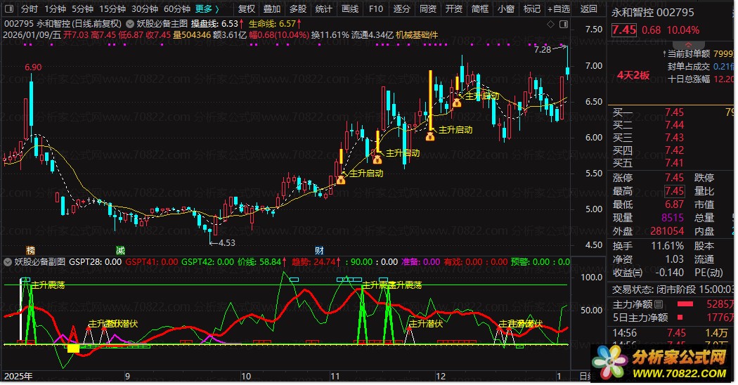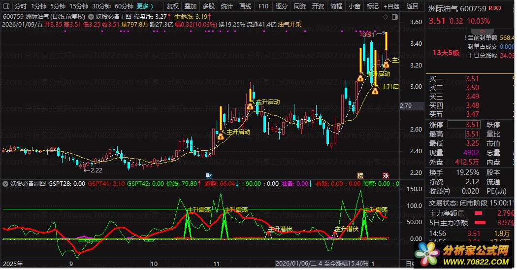 3 启动买点判断:主图主升启动信号与副图白色量能柱形成共振时,是妖股启动买点,此时介入可把握主升浪行情。