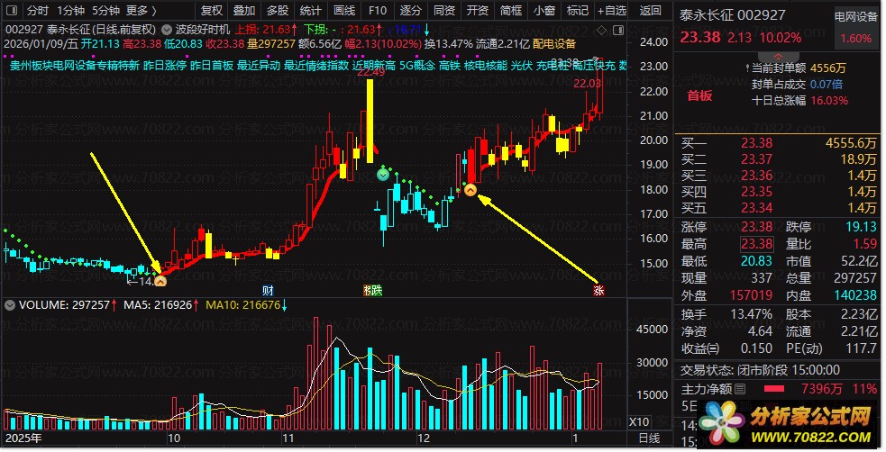 3. 在主图中,红色线段直观标识股价的上升阶段,绿色虚线则清晰标示股价的下降阶段,帮助用户快速识别当前市场趋势,把握波段买卖时机。
