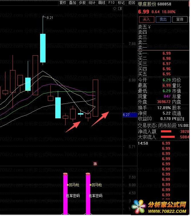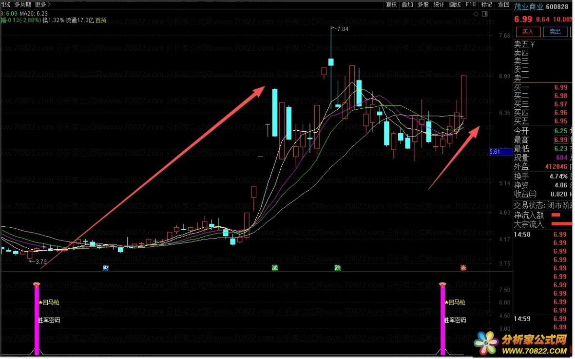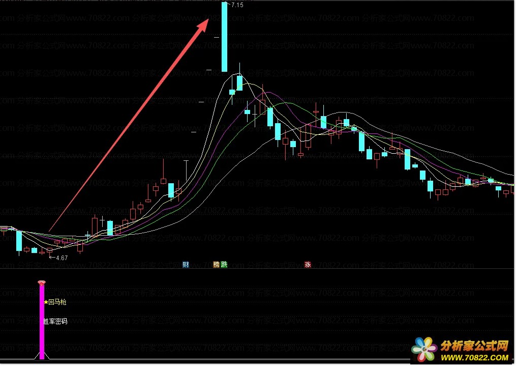 看信号 副图出现紫色柱及回马字样即为有效信号