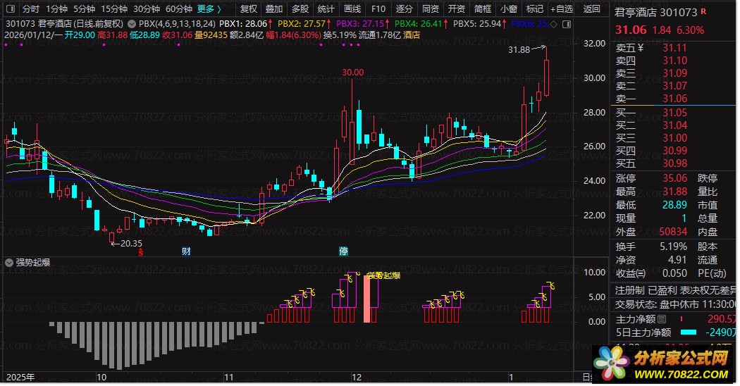 图表中以彩色柱状图直观呈现:灰色代表弱势,红色柱体标识动能增强,粉红色加粗部分突显爆发力强劲阶段,而“飞”字与“强势起爆”文字提示则在关键买入点发出明确信号。适用于震荡市末期或突破初期,帮助投资者提前埋伏即将开启主升浪的潜力股。