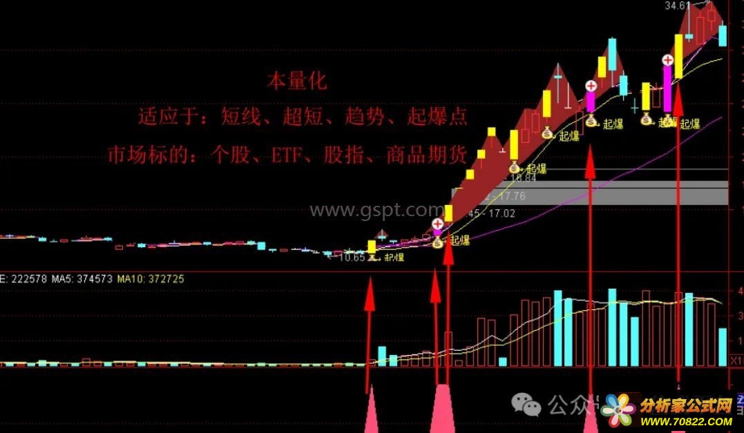 公式首先筛选出当日涨幅超3%且收阳的个股,再结合EMA加权通道判断价格是否有效突破关键阻力;同时引入基于均价与标准差构建的动态压力位,确保股价处于强势区域。当多个突破信号叠加并满足“妖股”定义时,触发“GM”信号。