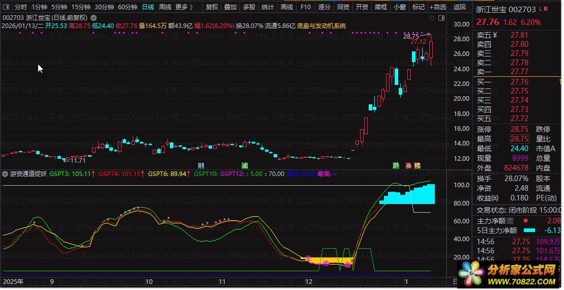 使用方法:将公式加载为副图,重点关注底部出现的“底”字、“追涨”提示或“千载难逢”信号,配合下方绿色/红色标记及成绩百分比,可高效筛选具备短线爆发潜力的标的。适用于震荡市或结构性行情中捕捉游资主导的热点龙头。