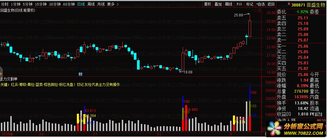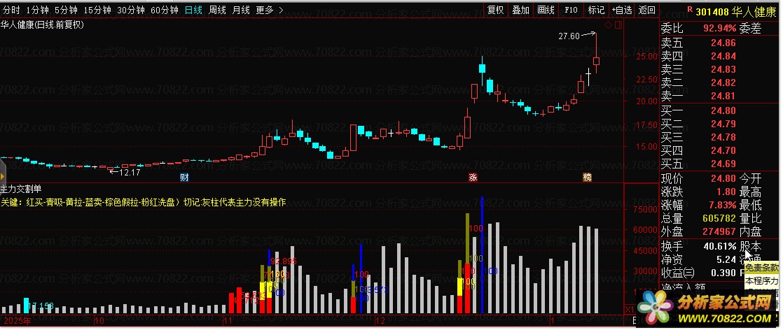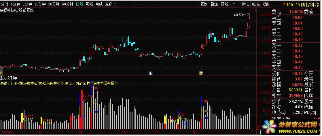「主力交割单」指标,精准解码资金行为 识破主力动向! 「主力交割单」是一款基于量价关系智能识别主力操盘阶段的通达信副图指标。它通过分析成交量、价格位置、K线形态及涨跌幅等多维数据,将主力行为划分为六大典型动作:建仓(红)、吸筹(青)、真拉升(黄)、假拉升(棕)、出货(蓝) 和 洗盘(粉红),并以彩色柱状图叠加在成交量上直观呈现。当无明显主力操作时,显示为灰色柱,提示观望。