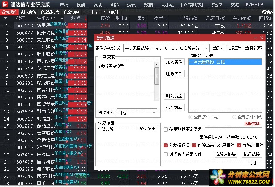 颜劼〖一字无量选股〗,某神光平台卖很多的指标。 颜劼无量一字选股器,9:30之后选股