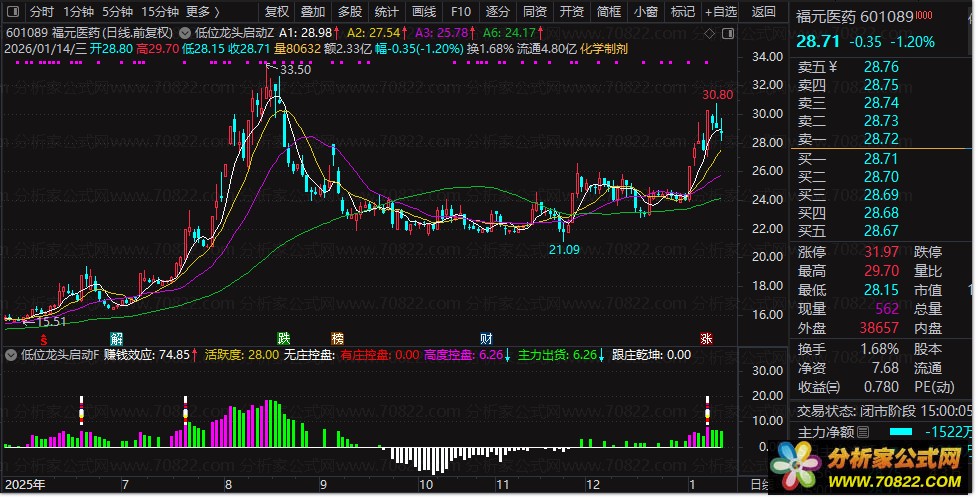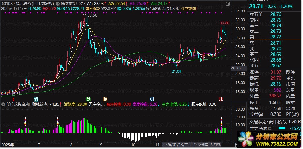 〖低位龙头启动〗套装——捕捉主力悄然建仓的爆发前夜! “低位龙头启动”指标系统由主图、副图与选股三部分构成,专为挖掘处于底部区域、即将强势启动的龙头股而设计。主图通过多周期均线与动量指标识别趋势拐点,并标注“半路追涨”“加仓”信号;副图融合筹码分布、控盘力度、涨停统计及主力行为模型,直观呈现“强庄”“跟庄乾坤”等关键信号;选股公式则聚焦近期强势突破且符合龙头特征的个股,排除ST、科创板、北交所等高风险标的。
