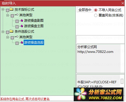 * 关于股票公式时间限制,如果在引入大智慧公式,交易师公式或者飞狐公式的时候,发现公式名称栏是空白的,这时候调整电脑时间到1997年,又能出现公式名称,并且能正常显示,可能是公式使用期限已过。