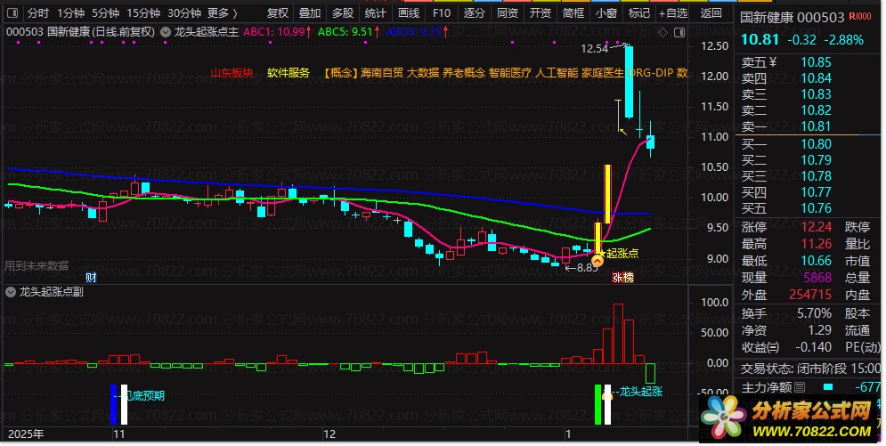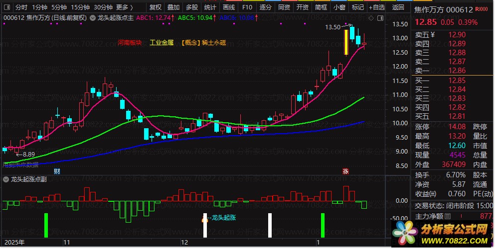 2. 副图中“龙头起涨”文字与图标提示配合能量柱,辅助确认买点;