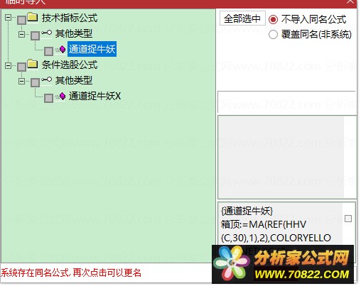 * 关于股票公式时间限制,如果在引入大智慧公式,交易师公式或者飞狐公式的时候,发现公式名称栏是空白的,这时候调整电脑时间到1997年,又能出现公式名称,并且能正常显示,可能是公式使用期限已过。