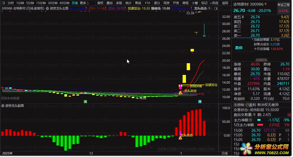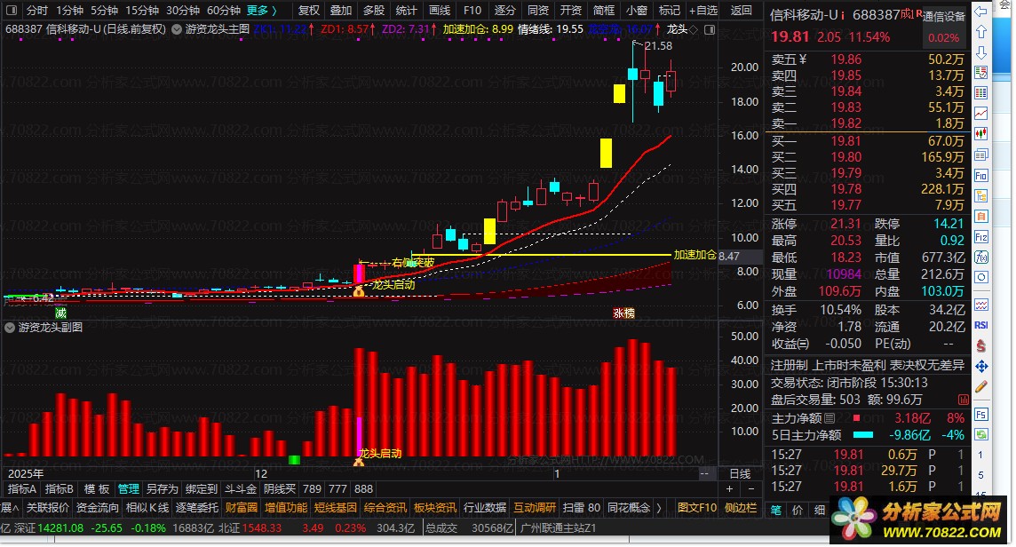 “游资龙头”三件套,擒龙在手 擒龙在手 精准狙击主升浪 “游资龙头”公式组合由主图、副图与选股三部分构成,专为捕捉强势龙头股设计。主图融合多周期EMA通道、资金异动信号与涨停识别,通过黄色带状支撑区与红色“龙头异动”提示,直观揭示主力介入点;副图以DMI改进算法刻画多空动能,并叠加“暴利模式”与“妖股突破”逻辑,用彩色柱状图清晰呈现游资进攻节奏;选股公式则聚焦“倍量突破前高”这一经典龙头启动信号,过滤杂波,高效锁定潜力标的。使用时,建议结合主图“龙头启动”图标与副图红柱共振信号,在放量突破关键压力位时果断介入,适用于短线追强或龙头战法选手。