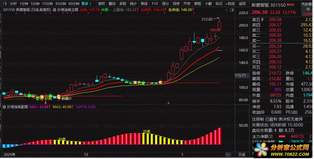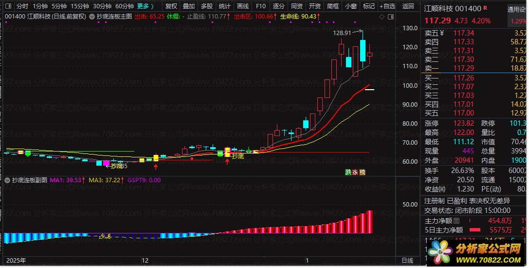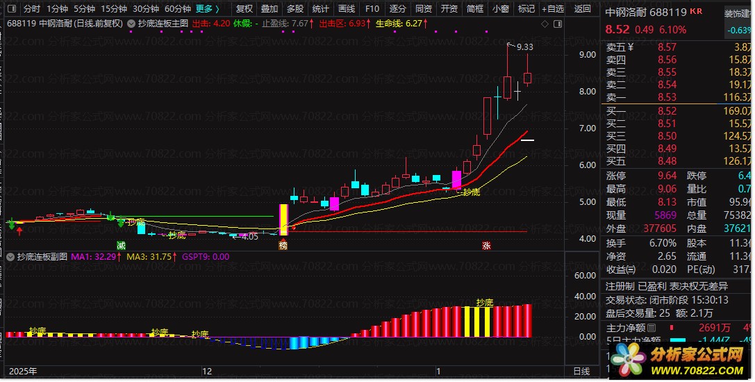 建议将主图与副图结合使用。当选股公式或副图出现`MA1上穿0轴`的“抄底”信号时,切换到该股主图,若同时出现“--抄底”文字、接近“生命线”支撑或出现洋红色连板形态K线,则可提高交易决策的可靠性。