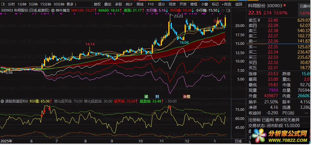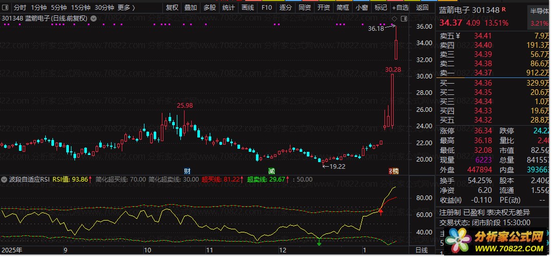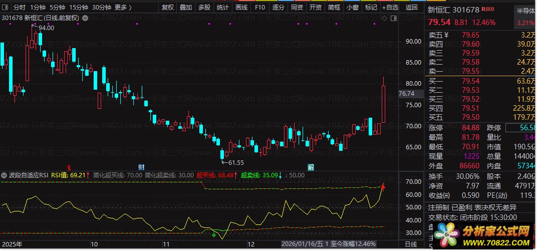 “波段自适应RSI”是一款融合波动率、市值规模与价格趋势的智能型RSI指标。它突破传统固定超买/超卖线(70/30)的局限,根据个股上市时间、流通市值、近期波动率及中长期趋势动态调整阈值,实现对不同市场环境的自适应响应。新股采用简化模式确保稳定性,老股则启用完整逻辑,结合波动率标准分数与趋势强度因子,智能拓宽或收窄超买超卖区间。
