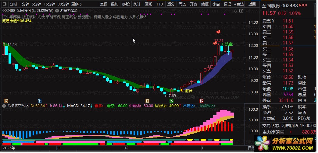 本公式融合价格偏离度、动量趋势、量价配合及超买超卖信号,构建出一套多周期共振的智能操盘体系。通过6日、24日、32日三条均线偏离度合成主趋势信号,并结合34日与75日高低点通道计算市场情绪强度,辅以MACD增强型动量和J/D/K三线交叉判断,精准识别“看多”“看空”“中短线”“超短线”四大操作区域。特别设置“龙虎战区”警示带,提示主力博弈关键节点分析家公式网http://www.70822.com。