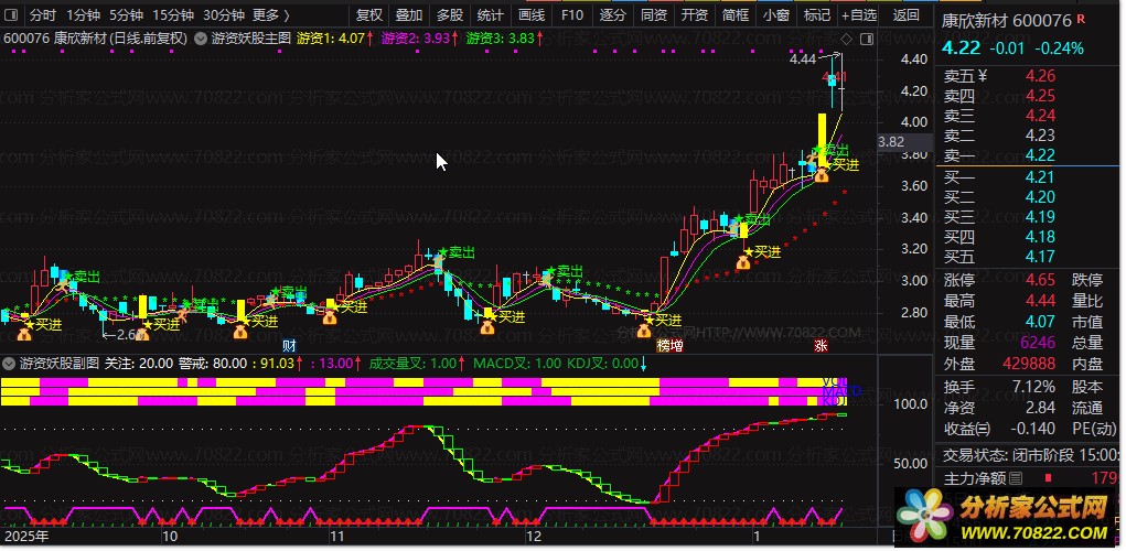 选股公式出标的 → 看副图是否三线粉色共振(量能+MACD+KDJ) → 看主图是否出黄色买进信号 → 三者全部满足,果断介入;持股至主图出卖出信号/副图妖股曲线变绿,止盈离场,完美贴合游资妖股的波段节奏!