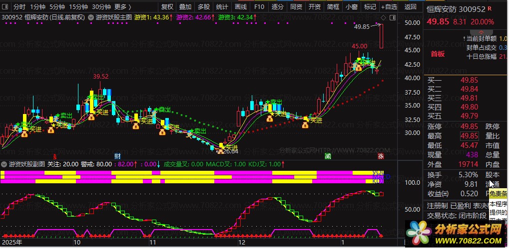 主图:显示三层游资趋势线+20日均线多空标识+精准黄字★买进/绿字★卖出信号+买卖图标,直观判断持仓/离场时机;