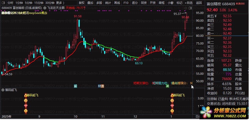 副图公式通过多重条件过滤——包括价格连续波动模式识别、MACD金叉、KDJ低位金叉、以及自定义动量指标交叉等——综合判断是否出现“筹码集中后向上突破”的高胜率买点,并以醒目的彩色柱状图和多图标提示“筹码起飞”信号。
