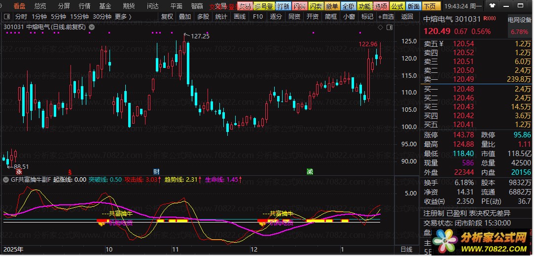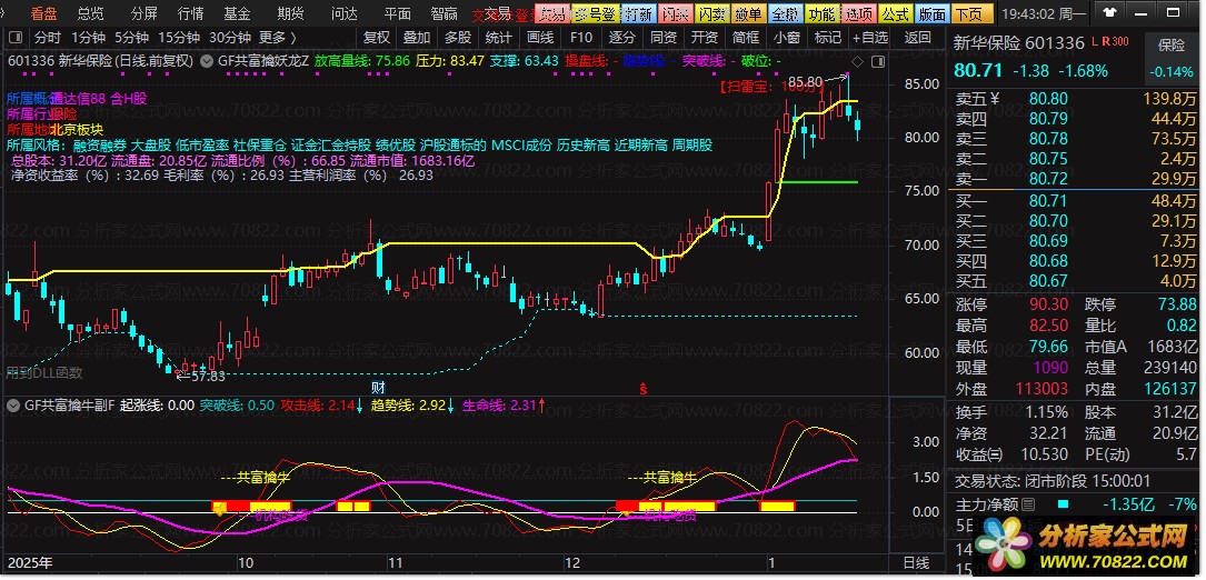 - 共富擒牛信号:当持仓线突破生命线、攻击线上穿趋势线,且共振得分≥7时触发,以黄色箭头及文字标注,提示趋势启动。