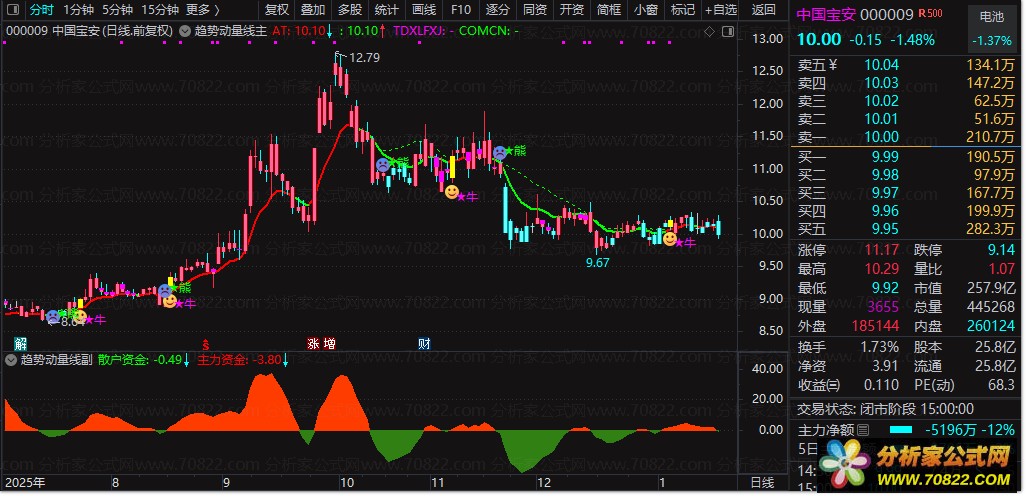 趋势线:该指标融合3日、6日、12日、24日均线的算术平均值,生成「AT线」(图中红色粗线),作为中短线趋势动量的综合参考依据;