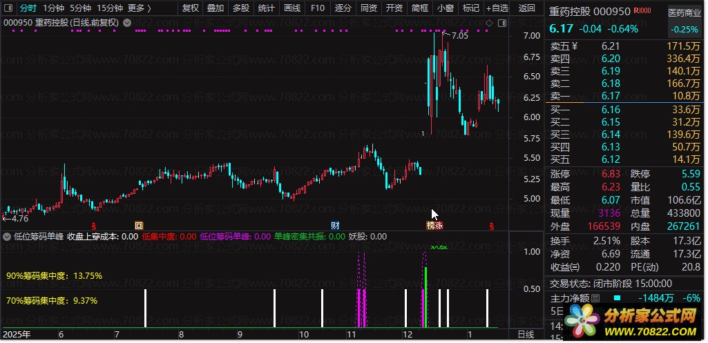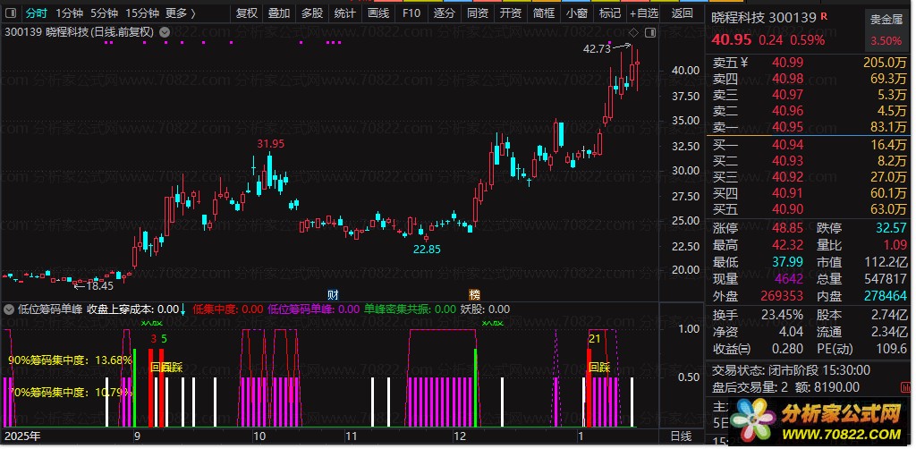 1. 低位筹码单峰:核心信号。当90%筹码集中度<10% 且70%集中度<6%,表明筹码高度锁定;同时股价突破近期横盘区间,且收盘价位于密集筹码峰的中低位区域,形成典型的“单峰密集”结构。