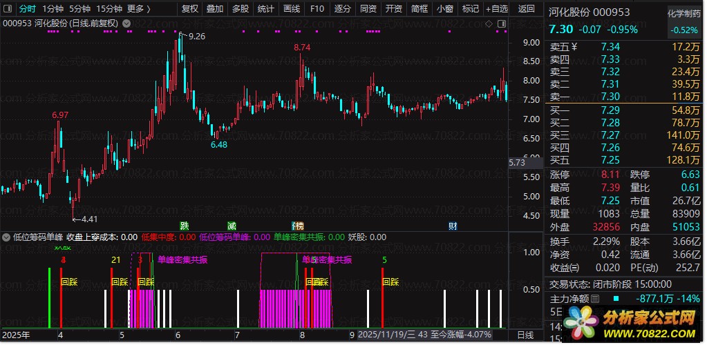 低位筹码单峰副图:出现紫色柱密集的地方就可以关注了,低位集中度少于12%后越少越好,阳线 启动向上突破丫稳后会现一波行情。