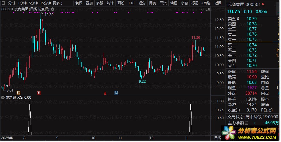 当一波上涨行情结束后进入回调阶段,【龙之眼】指标重点关注5日均线与10日均线的交叉行为:首先,5日线向下死叉10日线,随后迅速回升并向上金叉10日线。关键在于,在整个死叉到金叉的过程中,5日线与10日线始终未有效跌破20日均线(主图中通常以紫色线标识)。这一特征充分体现了股价回调的强势性与支撑的有效性,是“闭环形态”的核心标志。